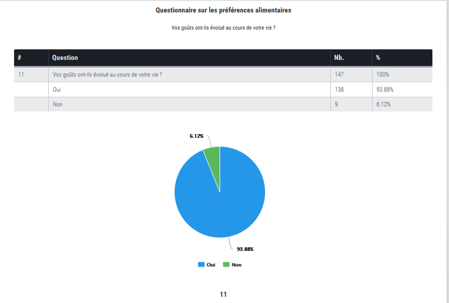 Nous avons donc vu que l'habitude est capable d'influencer nos préférences alimentaires, mais aussi que l'âge est un autre facteur important. Ce dernier point peut-être vérifié par les résultats de notre questionnaire. En effet, nous avons pu constater des différences de préférences alimentaires entre les tranches d'âge et des similitudes au sein de celles-ci. Par exemple, en dessous de 10 ans, les enfants ont