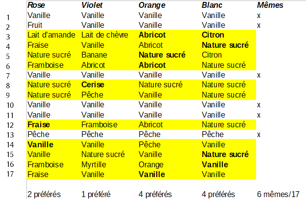 Parmi les personnes qui ont trouvé que les yaourts étaient différents, 4 ont préféré le yaourt orange, 4 ont préféré le blanc, 2 ont préféré le rose et une seule a préféré le violet.