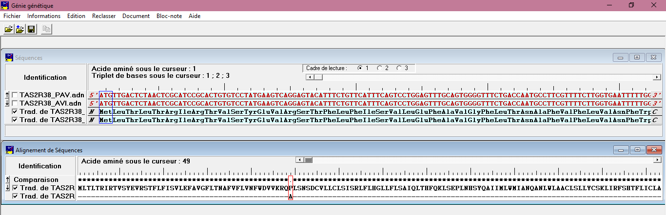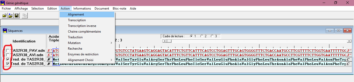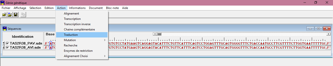 A l'aide de l'option "traduction", nous traduisons les séquences du gêne (séquences de nucléotides) en protéine (donc en séquences d'acides aminés) et nous les comparons pour voir si les mutations se sont bien exprimées.