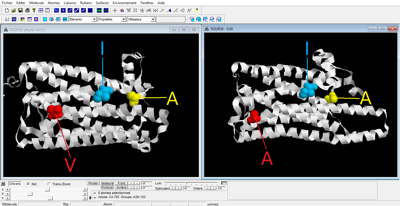 Mais la question que nous nous sommes ensuite posée est : comment ces trois mutations modifient la sensibilité au PTC ? Nous avons pour cela étudié la forme des protéines codées par les deux allèles sur le logiciel Rastop et avons comparé leur forme.